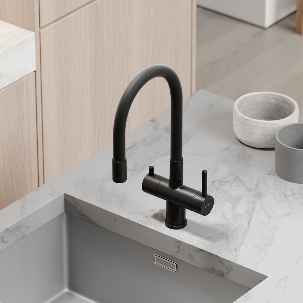 Смеситель для кухни Sancos Lucia SC4004MB с гибким, поворотным изливом и подключением фильтра питьевой воды , материал - латунь, цвет - чёрный матовый/чёрный.