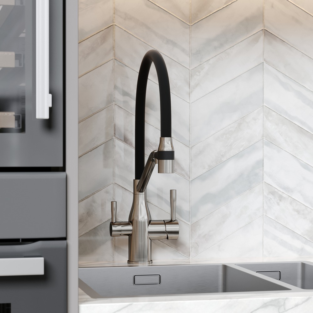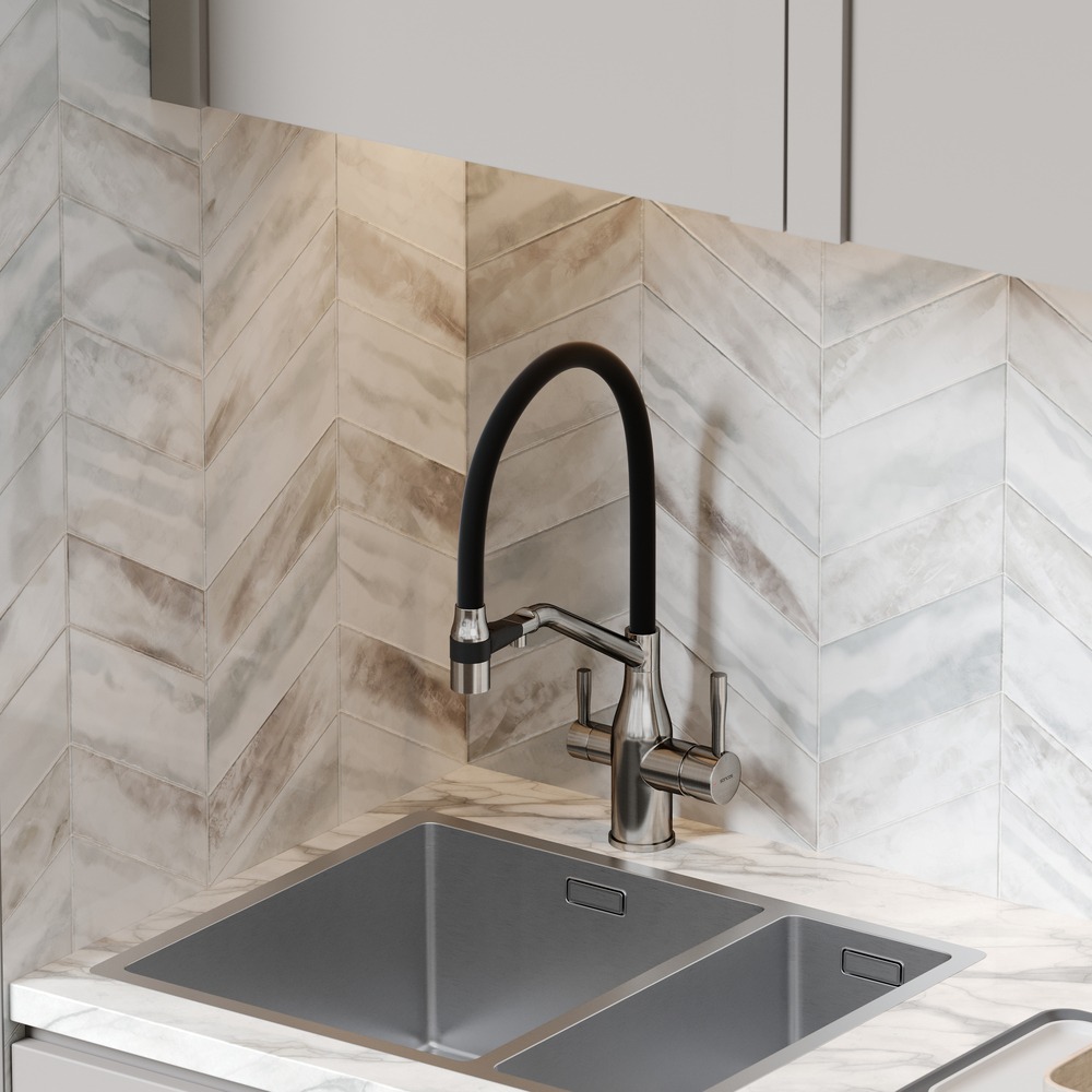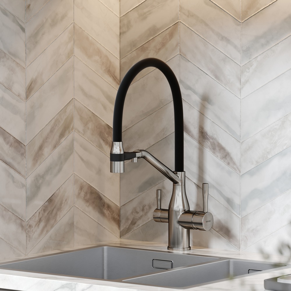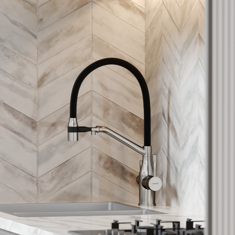 Смеситель для кухни Sancos Orta SC4008BN с гибким, поворотным изливом и подключением фильтра питьевой воды, материал - латунь, цвет - никель/чёрный.