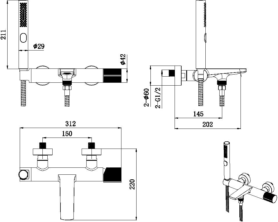 - Душевой набор: ручной душ ABS, 3и режима, шланг 1.5 метра SUS304