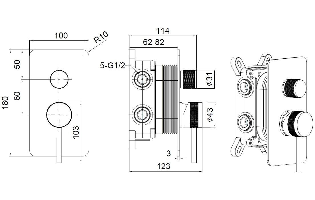 • для 3х потребителей воды, дополнительно приобретается оборудование на 3и потребителя (Пример: №1 верх.душ + №2 душевой набор с водорозеткой + №3 излив ИЛИ другие комбинации из 3х элементов)
