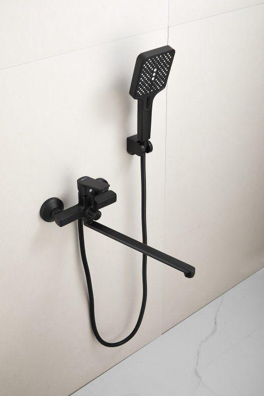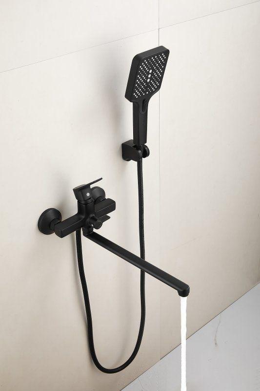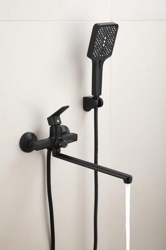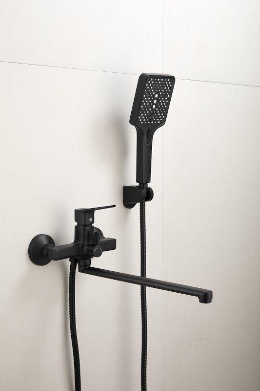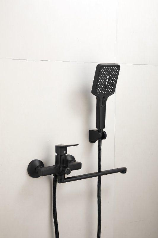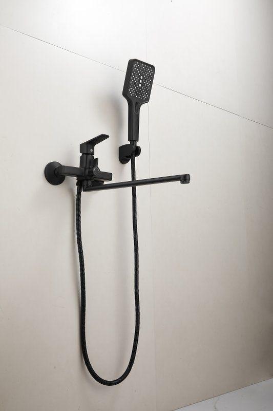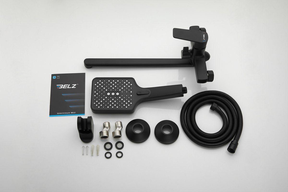 Смеситель для ванны Belz B22715-7 с длинным изливом и душевым гарнитуром, материал латунь, цвет чёрный матовый.