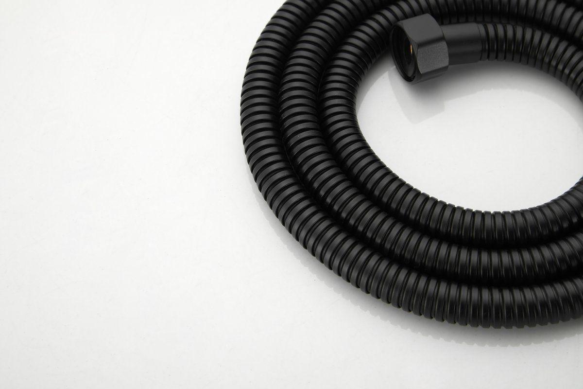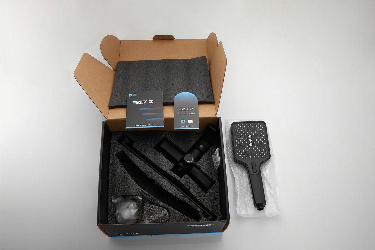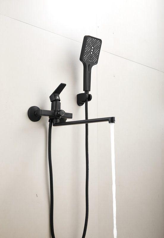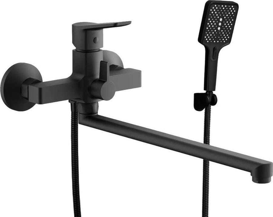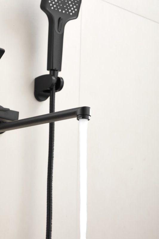 Смеситель для ванны Belz B22715-7 с длинным изливом и душевым гарнитуром, материал латунь, цвет чёрный матовый.