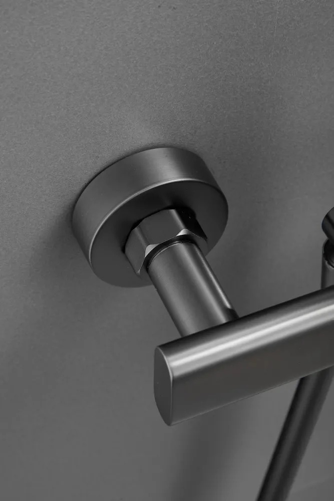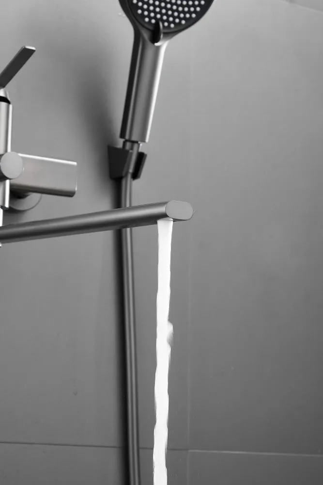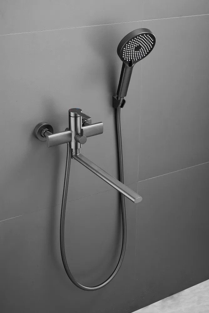 Смеситель для ванны Belz B22813-3 с длинным изливом и душевым гарнитуром, материал латунь, цвет оружейная сталь.
