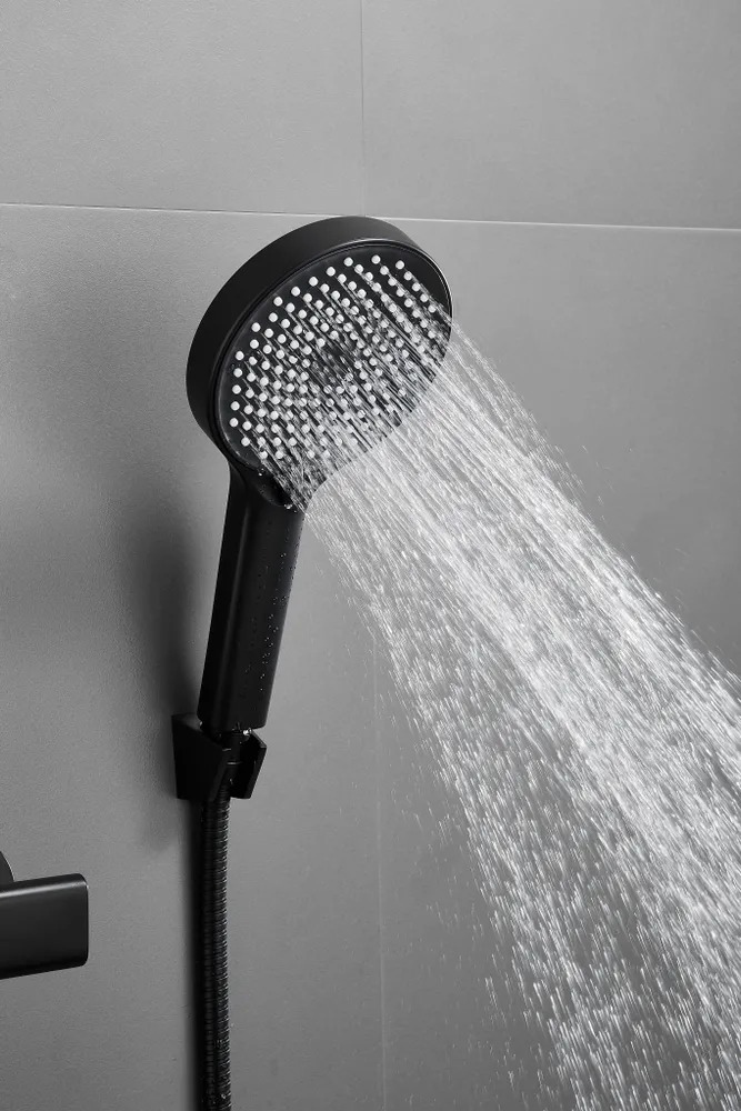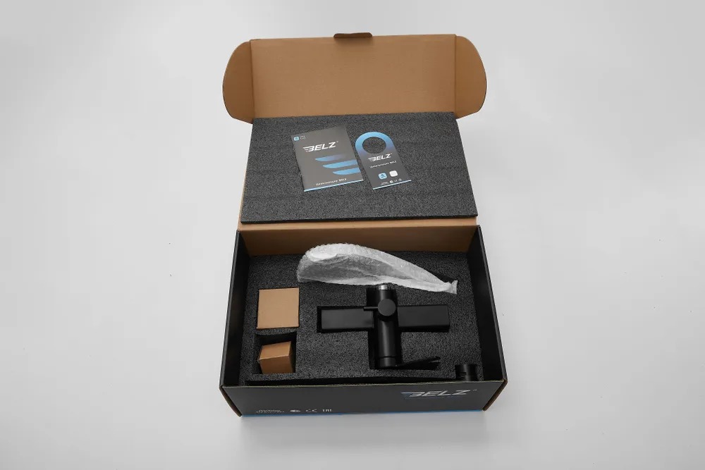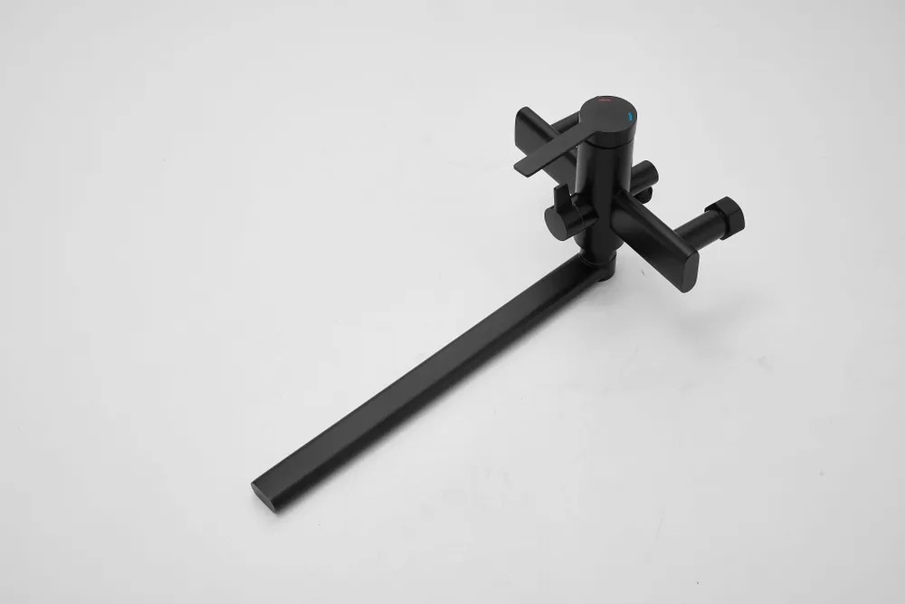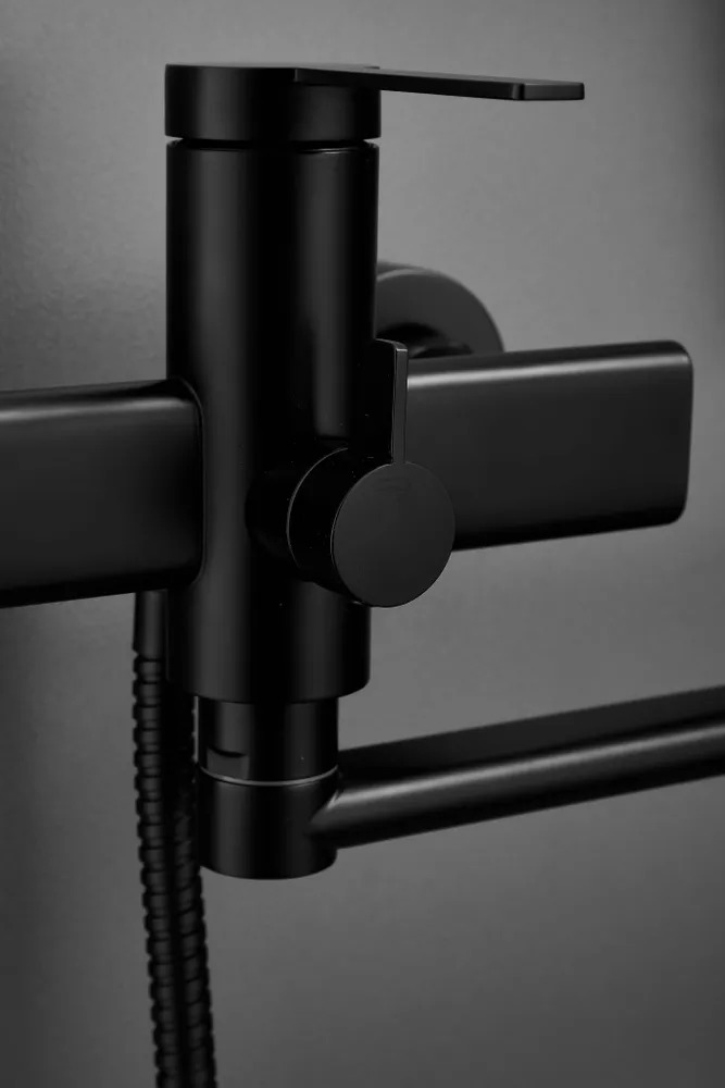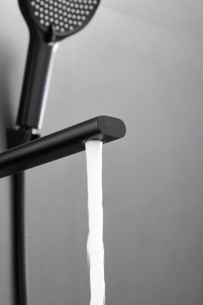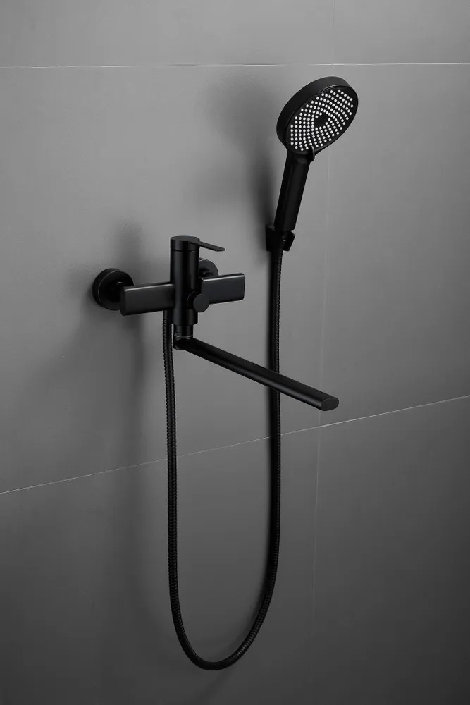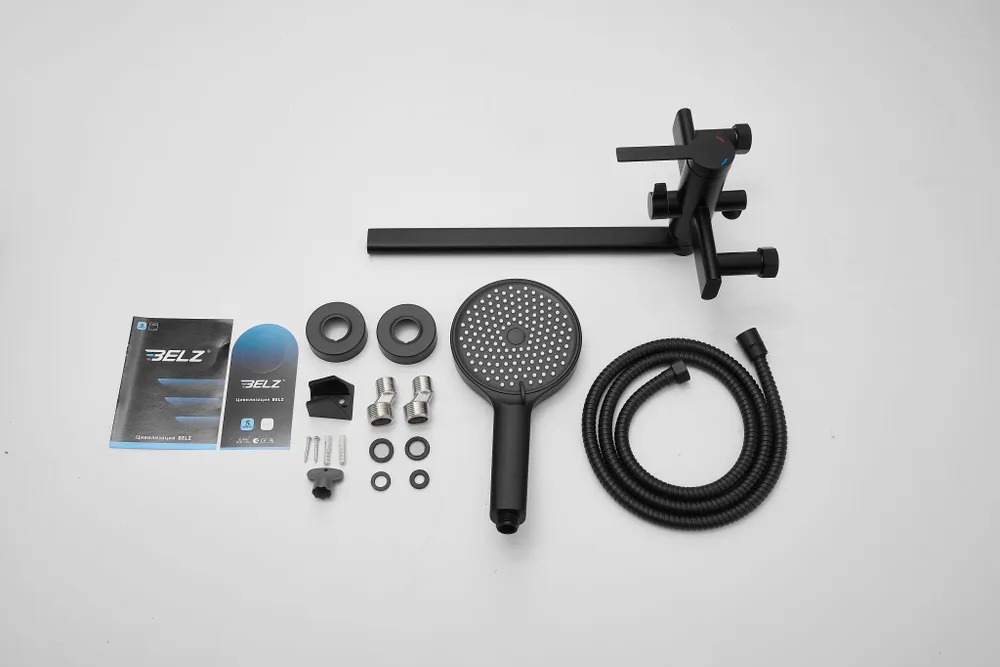 Смеситель для ванны Belz B22813-7 с длинным изливом и душевым гарнитуром, материал латунь, цвет чёрный.