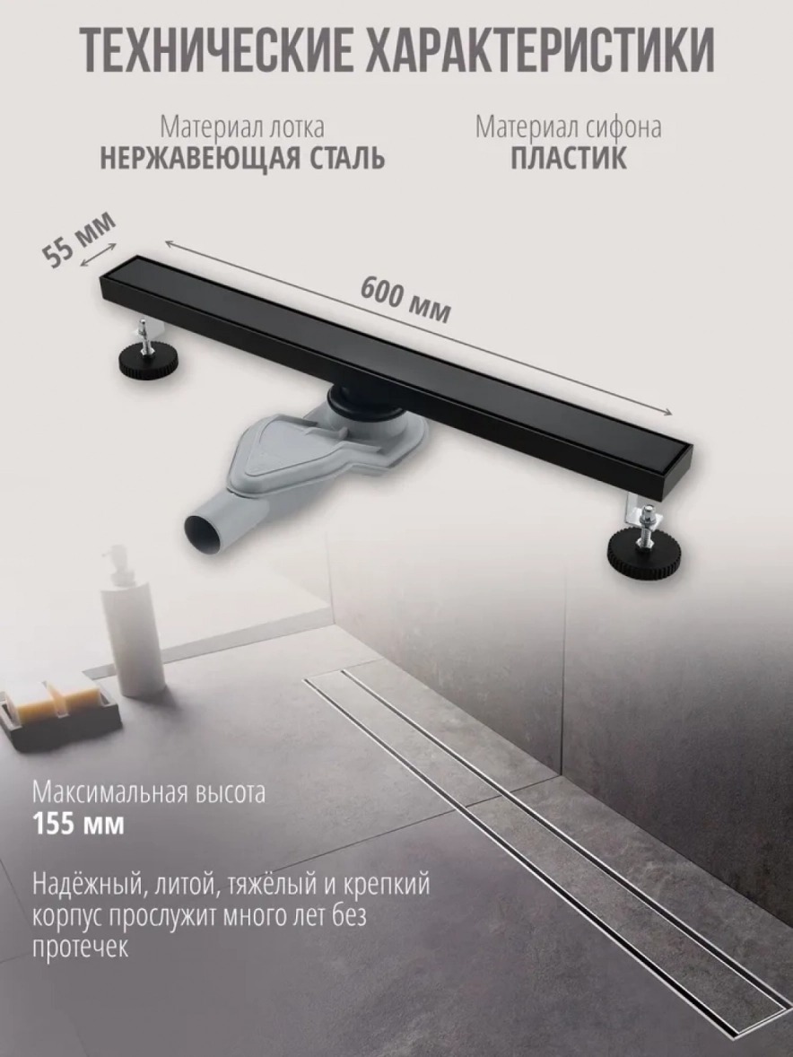 Трап Grocenberg 60 см T600BL, чёрный матовый (под плитку)