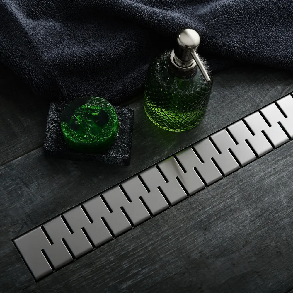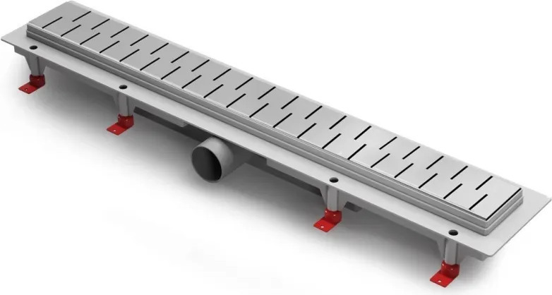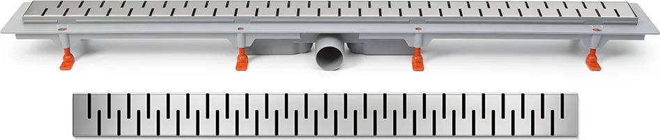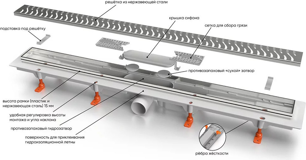 В комплект входит самоклеящаяся гидроизоляционная пленка, сетка для сбора волос, регулируемые ножки, комплект креплений, пластиковый ключ для снятия нержавеющей решетки и инструкция по установке.