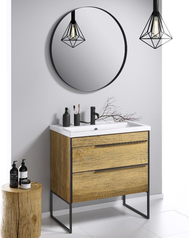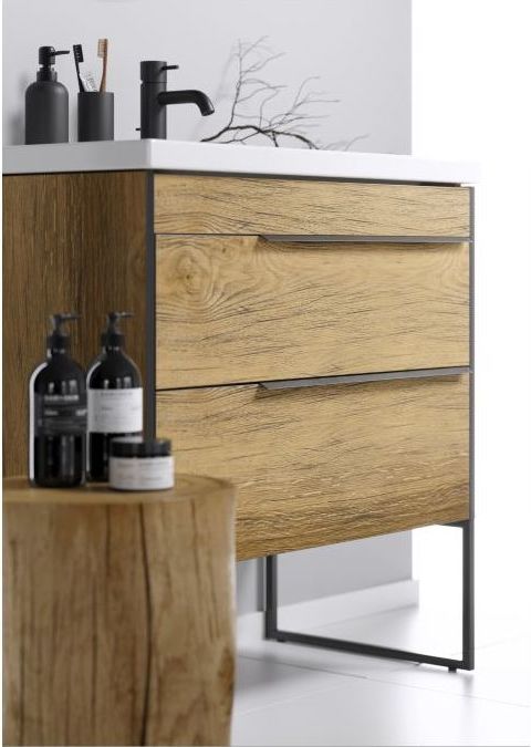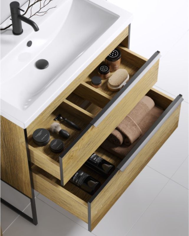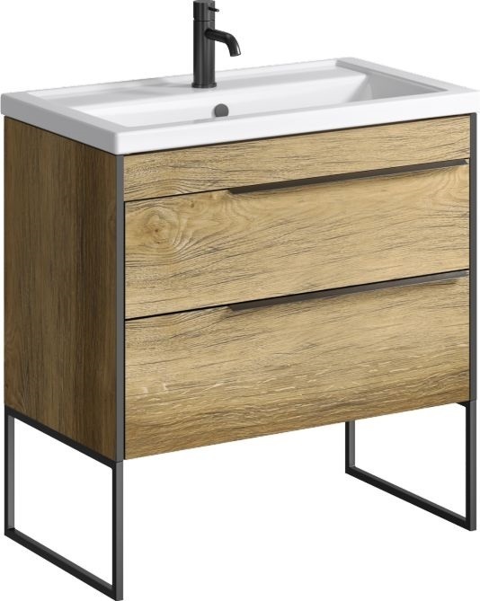 Тумба напольная Aqwella Fargo 80 см с раковиной Фостер 80 см, с двумя ящиками, оснащенными скрытыми направляющими австрийской фирмы Blum с системой мягкого закрывания, цвет дуб балтийский.
