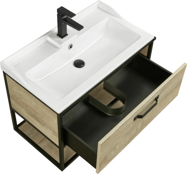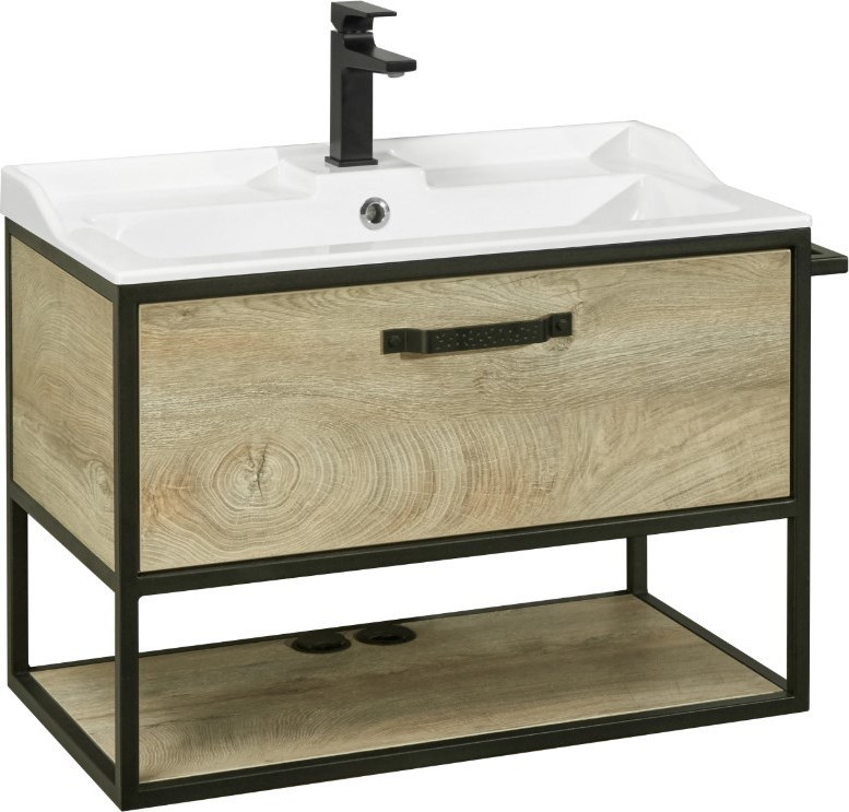 Тумба подвесная Акватон Лофт Фабрик 80 см 1A242401LTDU0 с раковиной Фабиа 80 1A708031FB010, цвет мебели - дуб эндгрейн, цвет фурнитуры - черный.