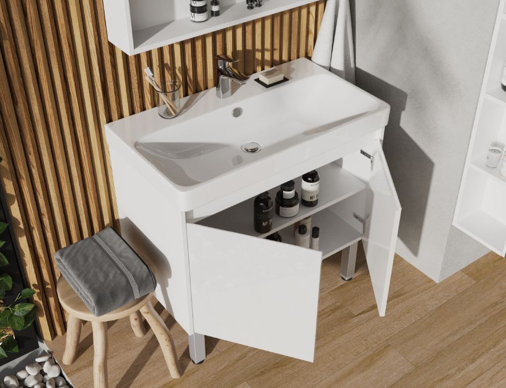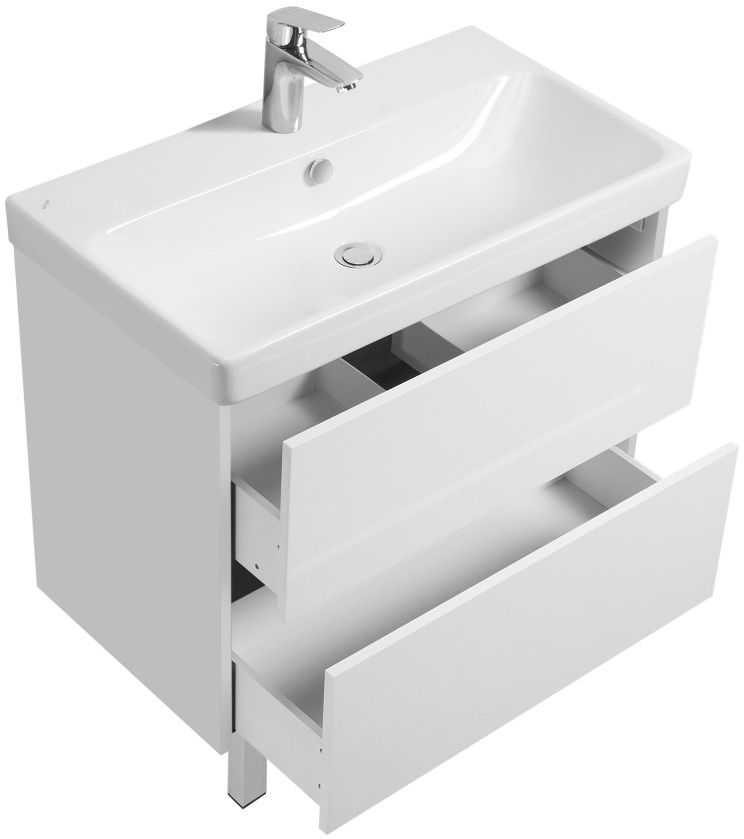Тумба Сканди 80 выполнена в популярном минималистичном скандинавском стиле. Корпус тумбы выполнен из влагостойкой ЛДСП в белой матовой покраске, а фасады в белой глянцевой покраске. Конструктивно тумба состоит из 2 вместительных ящиков, установленных на направляющие с интегрированной системой push-to-open для комфортного использования. На тумбе нет выступающих деталей и фурнитуры, открытие ящиков реализовано нажатием на фасад. Тумба комплектуется белоснежной раковиной Адриана от бренда Santek. Тумбу по желанию можно использовать в двух вариантах: как подвесную или дополнительно приобрести опоры