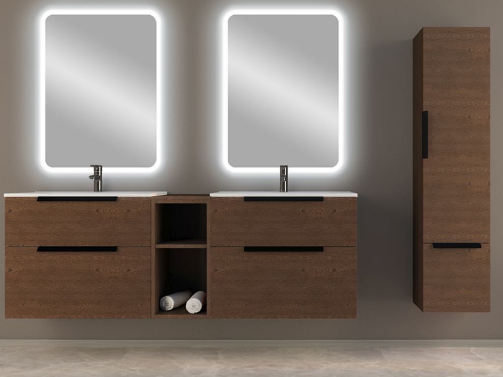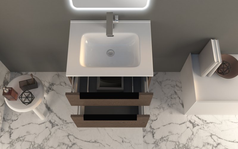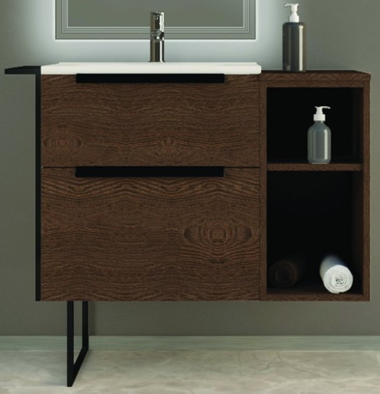 Тумба подвесная Cezares Urban 60 см с раковиной 50202 и подвесным шкафчиком с открытыми полками, оснащена 2 выдвижными ящиками с доводчиками SOFT, цвет мебели - Frassino scuro, цвет металлических ручек - черный матовый, внутренняя часть мебели цвет - антрацит. Ножка приобретается отдельно.