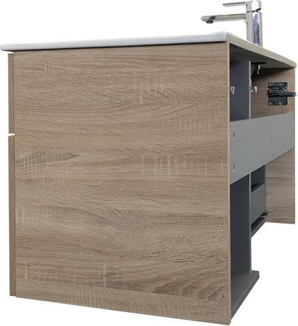 - Подвесная тумба с одним большим, одним малым выкатными ящиками и малой створкой оборудованными системами плавного закрывания. Корпус и фасад тумбы изготовлены из влагостойкого ДСП, созданного по уникальной технологии «Синхронное тиснение» в декоре «дуб сонома». Этот декор при прикосновении дарит ощущение натуральной древесины. Ручки тумбы из стального профиля окрашенного в белый цвет. Тумба подготовлена для подключения водоснабжения снизу.