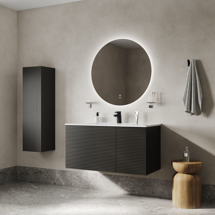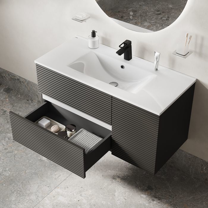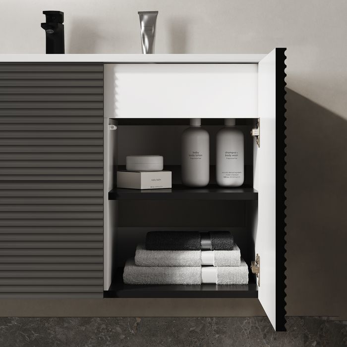 Вместительная подвесная тумба для ванной комнаты Bild с умывальником и выдвижными ящиками и полками – красивый дизайн с трендовой горизонтальной фрезеровкой в сочетании с популярным темно-серым цветом, удобством и практичностью. Материал фасадов – МДФ с покрытием ПВХ-пленкой. Она разработана для использования в помещениях с высокой влажностью и сохранит первоначальный вид мебели надолго (при должном уходе). Материал боковин – МДФ. Керамический умывальник с высоким бортом и большой вместительной чашей в комплекте. Удобен для гигиенических и хозяйственных нужд. Два ящика с направляющими скрытого монтажа с доводчиком Hettich и полки с распашной дверкой. Фурнитура рассчитана на более 10 лет исправной работы. Современный механизм открытия Push-to-Open – открывается нажатием на фасад. В комплекте крепеж для монтажа тумбы. Сифон приобретается отдельно. Гарантия на мебель IDDIS® – 3 года, на умывальник – 5 лет.