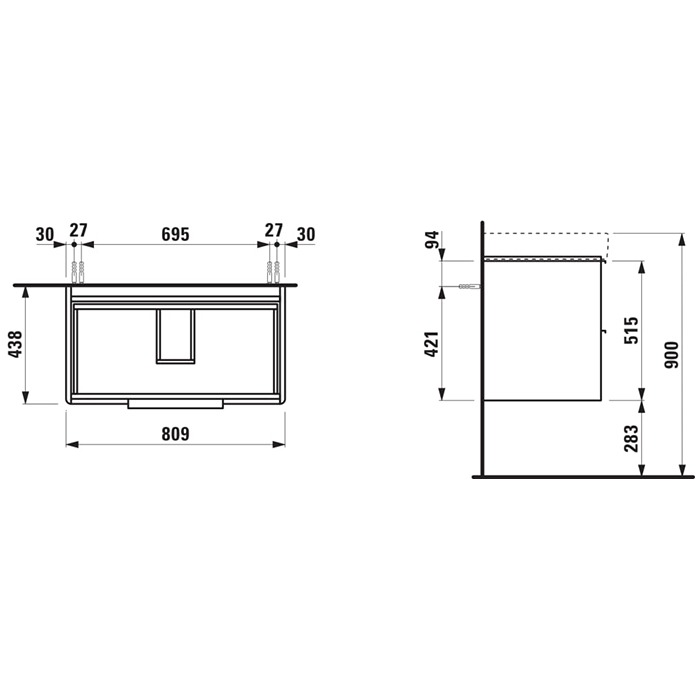 Тумба подвесная Laufen Base 4.0239.2.110.261.1 (810х515х438 мм) с 2 ящиками + раковина Laufen Pro S 8.1396.5.000.104.1 (850х95х465 мм), цвет белый.