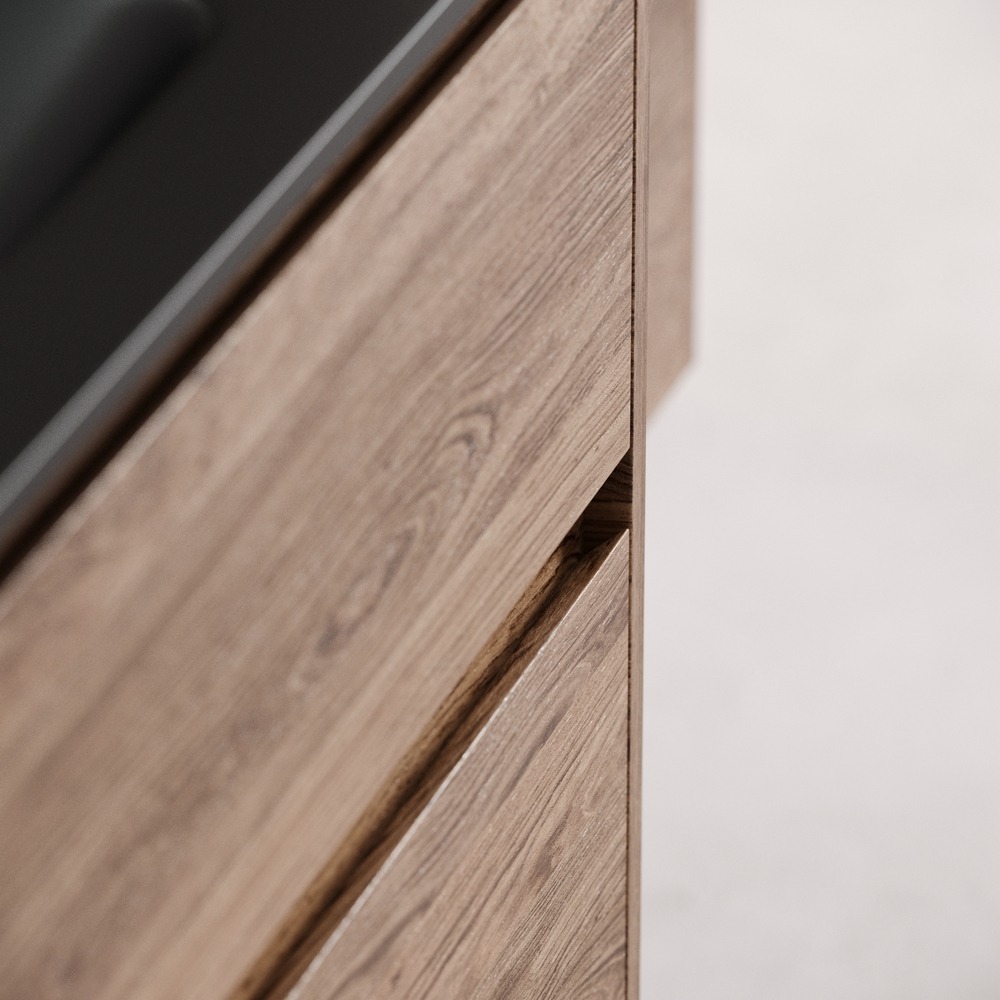 - Тумба подвесная Libra c двумя ящиками оснащенными доводчиками скрытого монтажа с системой плавного закрывания и с ручкой по всей длине ящика. Каркас и фасад тумбы выполнен из ЛДСП в цвете «дуб чарльстон». Покрытие - ламинат.