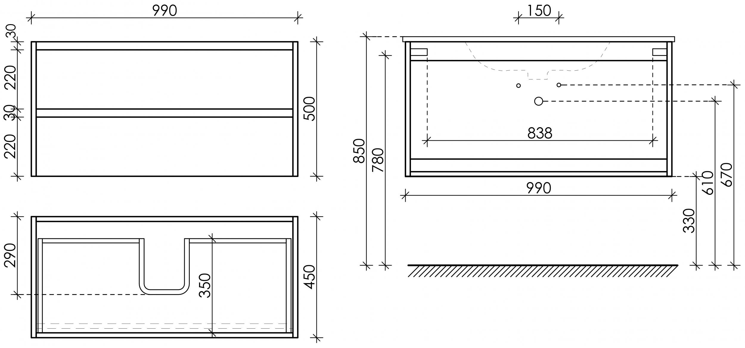 • Тумба подвесная Libra c двумя ящиками оснащенными доводчиками скрытого монтажа с системой плавного закрывания и с ручкой по всей длине ящика. Каркас и фасад тумбы выполнен из ЛДСП в цвете «дуб галифакс натуральный». Покрытие - ламинат.