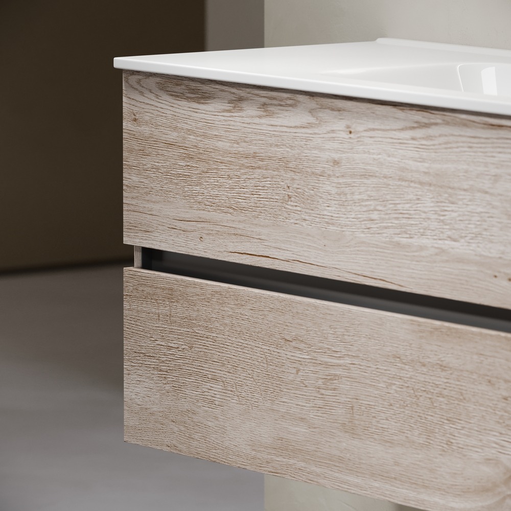 • Тумба подвесная Urban c двумя ящиками оснащенными доводчиками скрытого монтажа с системой плавного закрывания, а также с ручкой Gola по всей длине тумбы. Каркас тумбы и фасад выполнен из ЛДСП в цвете «дуб галифакс натуральный».