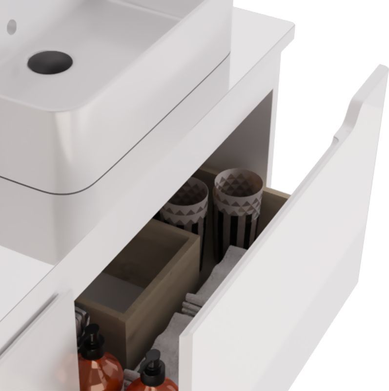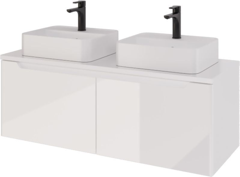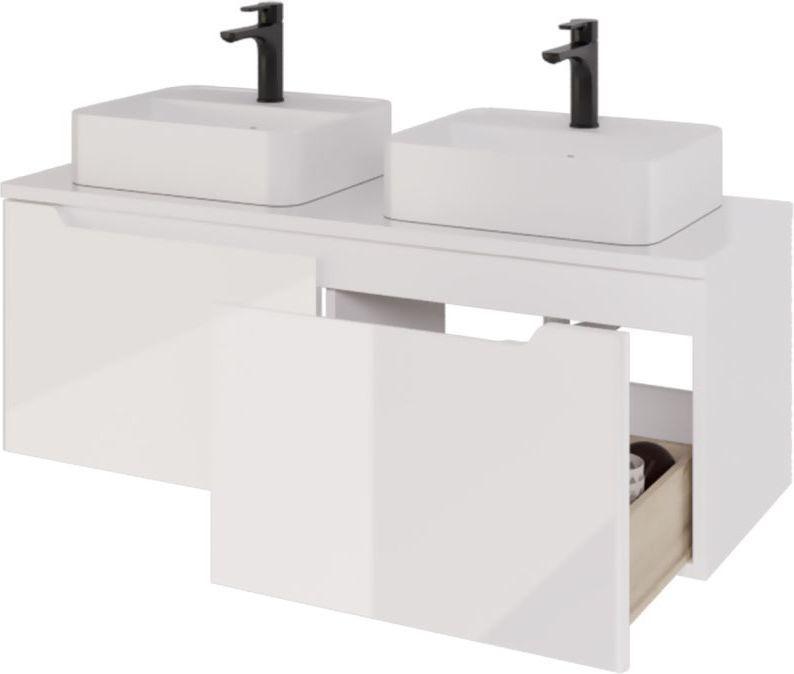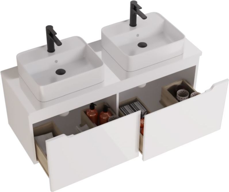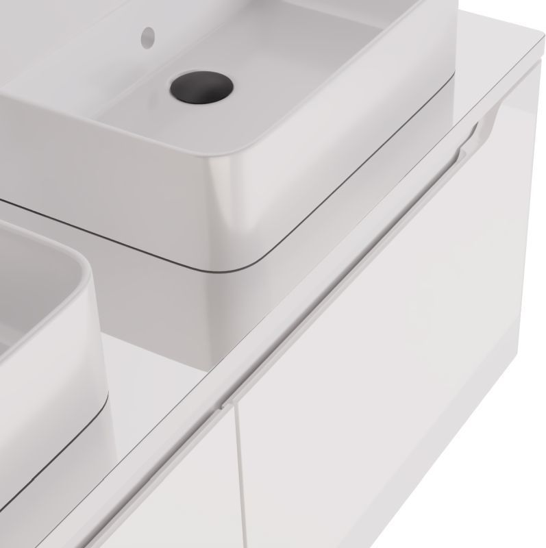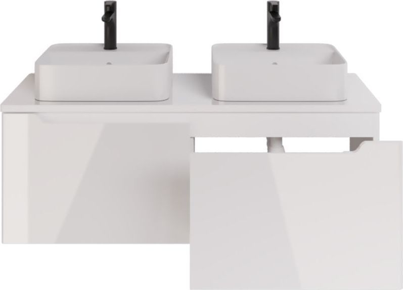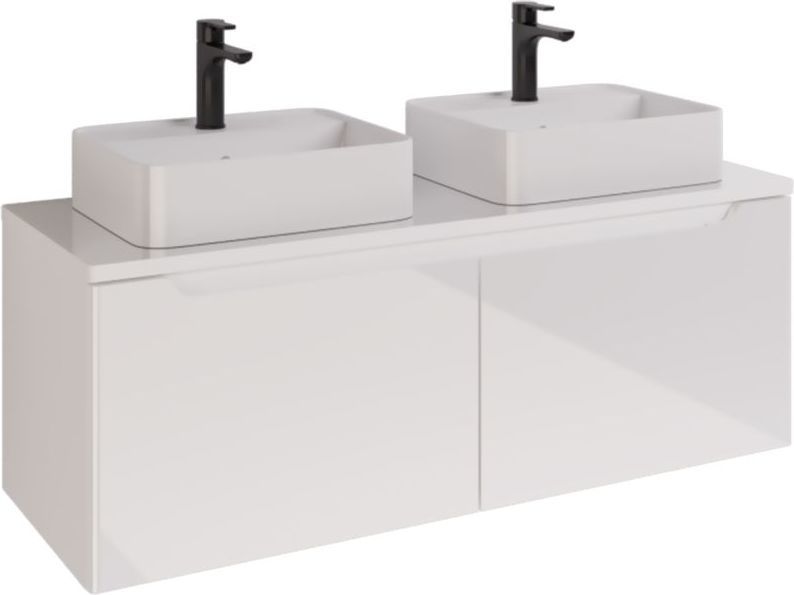 Тумба подвесная Dreja W 125 см 99.9400 со стеклянной столешницей W 99.9401 с отверстиями для установки 2-х накладных умывальников, 2 ящика, цвет белый глянец. Раковины приобретается отдельно.