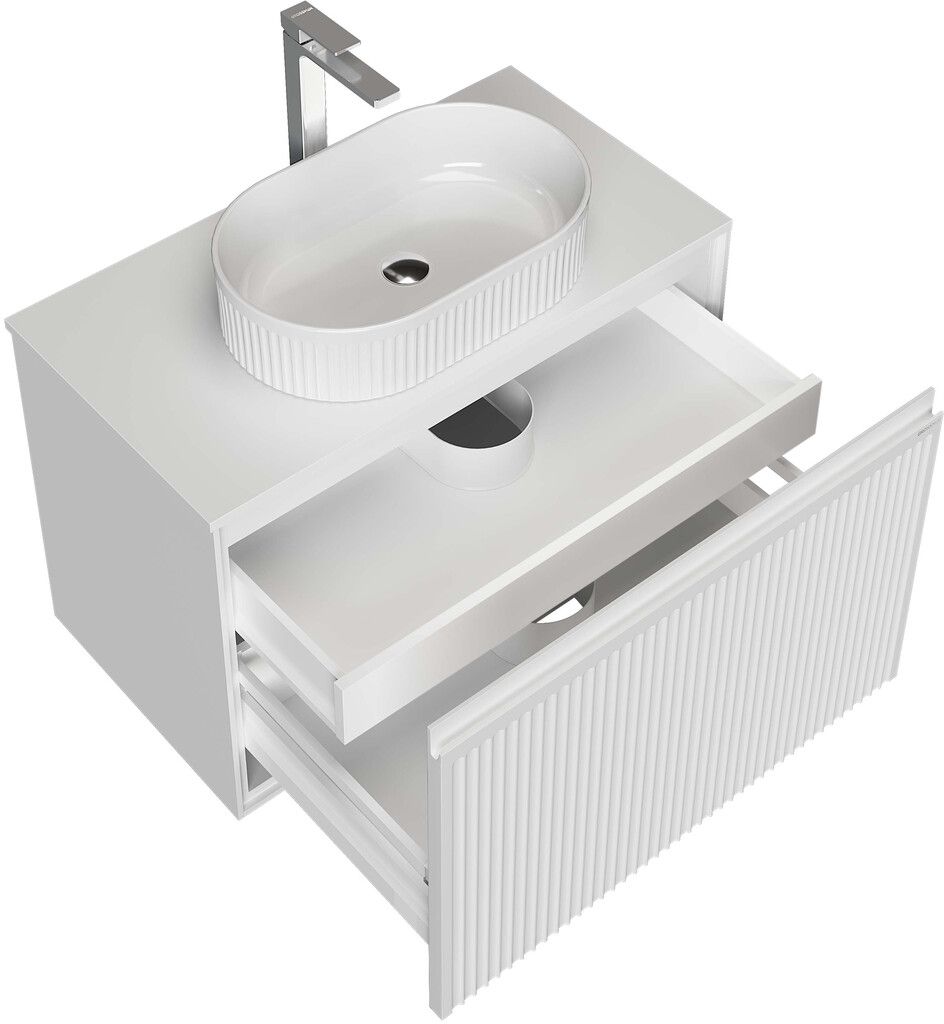 Подвесная тумба со столешницей Кристалл 80 см с 1 ящиком и органайзером, белый глянец — стильное и функциональное решение для современной ванной комнаты. Корпус и фасады выполнены из прочного МДФ, окрашенного в белый цвет с глянцевым эффектом. Элегантный фасад с вертикальным рифлением придаёт изделию изысканный внешний вид. Безупречный дизайн и скрытые направляющие с доводчиком обеспечивают комфортное и бесшумное использование. Тумба предназначена для настенного монтажа, в комплект входят надёжные подвесы для крепления. Столешница артикул 508055 из искусственного камня белого цвета идет в комплекте, но может быть заменена на другой цвет.