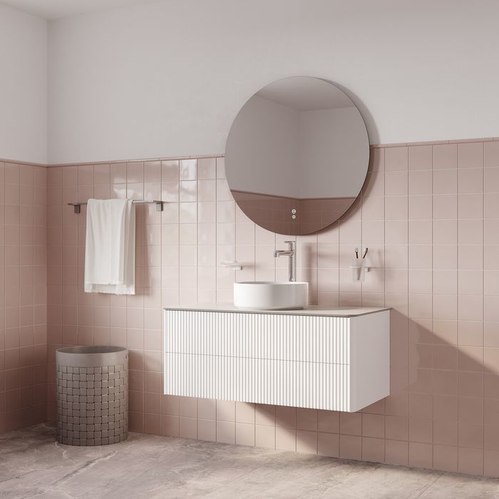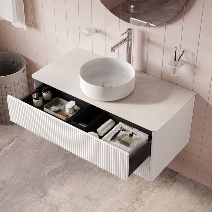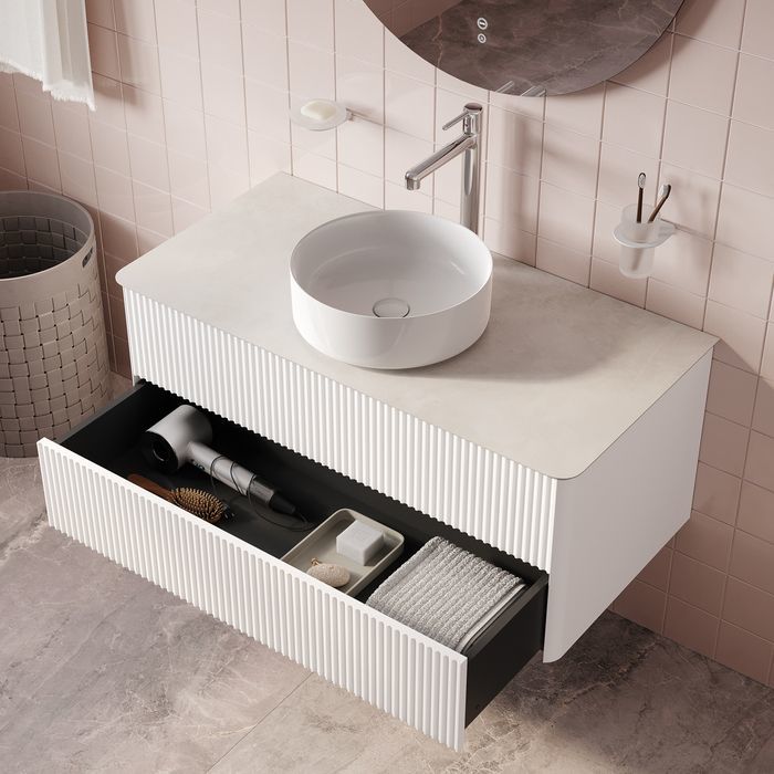 - Вместительная подвесная тумба для ванной комнаты Aiger с выдвижными ящиками и столешницей из керамогранита – красивый лаконичный дизайн вне времени с трендовой вертикальной фрезеровкой.