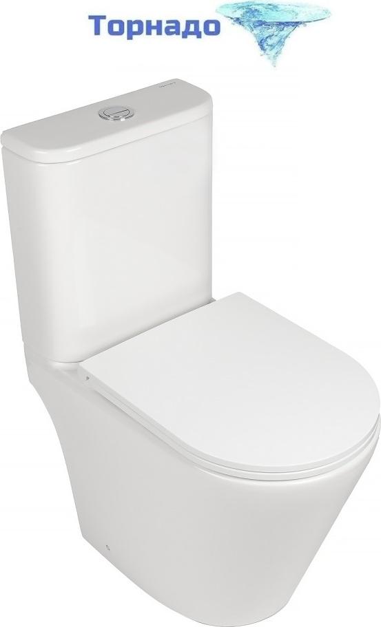 - Унитаз-компакт безободковый, со смывом скрытый Торнадо: струя воды из отверстия в чаше создаёт эффект водоворота, что позволяет полностью очищать всю внутреннюю поверхность унитаза.