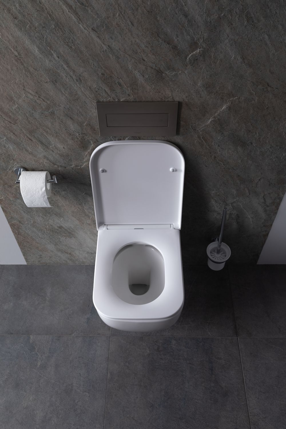 - Прямоугольный подвесной унитаз с мягкими углами Allen Brau Infinity белого цвета в стиле модерн — находка для любителей строгих форм и исполнений.