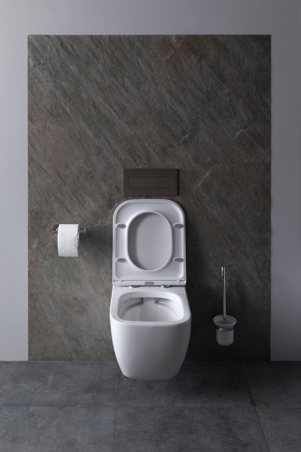 - Поверхность изделия глянцевая, а механизм смыва определяется системой инсталляции, встроенной в стену. Решение выглядит технологично и минималистично.