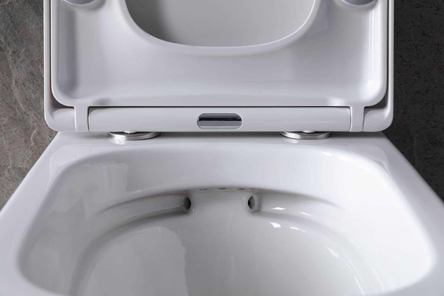 - Сам унитаз безободковый, что прибавляет ему гигиеничности: загрязнения не скапливаются в труднодоступных местах, а сама чаша быстро очищается подручными средствами.