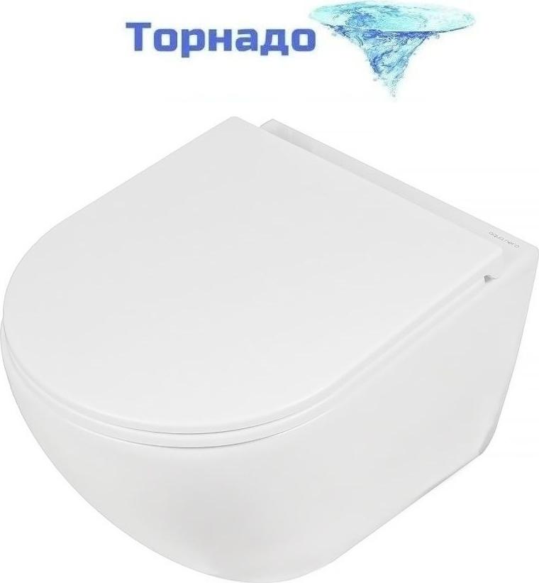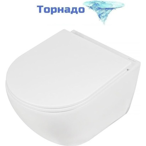 - Унитаз подвесной, безободковый, со смывом скрытый Торнадо: струя воды из отверстия в чаше создаёт эффект водоворота, что позволяет полностью очищать всю внутреннюю поверхность унитаза.
