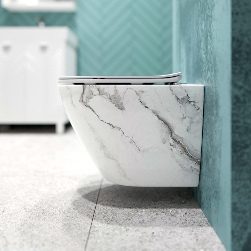 Унитаз подвесной безободковый EvaGold EG070017, каскадный слив, сиденье с тонкой крышкой микролифт, цвет белый мрамор.