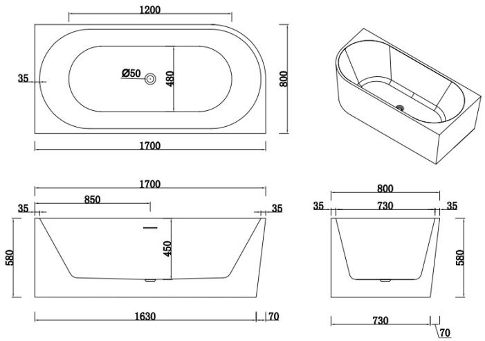 Ванна акриловая AN Amore, размер 1700x800x580 мм, расположение правостороннее, цвет белый.