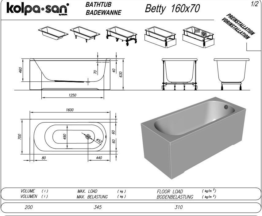 Характеристики ванна Kolpa-San (BETTY 160x70)