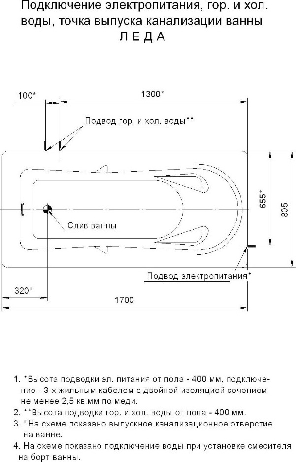 - отверстия под смеситель (при покупке ванна+смеситель отверстия отдельно заказывать не надо)