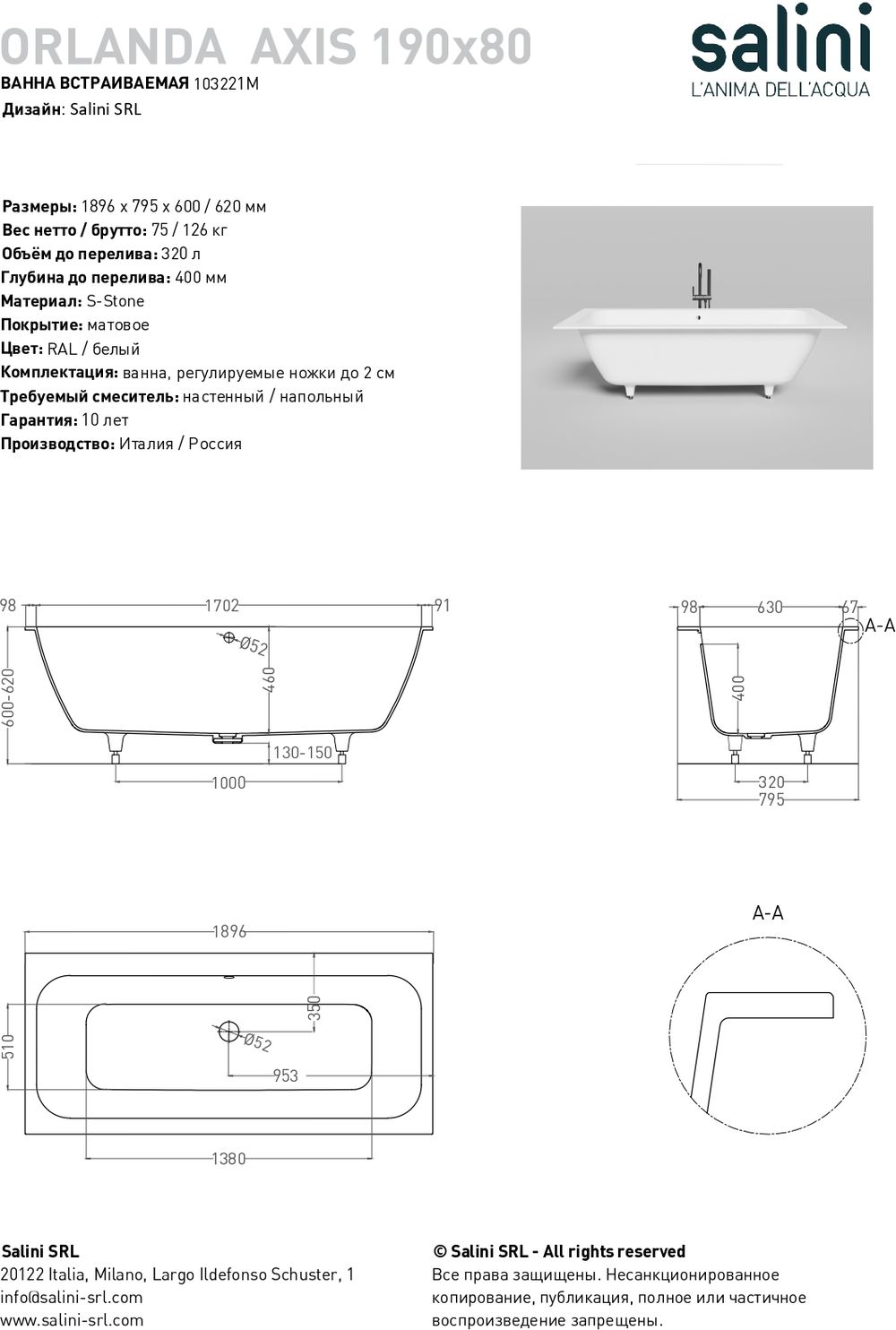 Ванна каменная Salini Orlanda 190x80 см 103221M (S-Stone) матовая