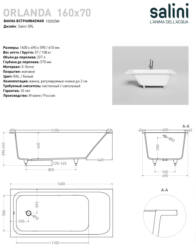 ORLANDA - серия встраиваемых ванн Salini. Эстетичная прямоугольная чаша с закруглёнными углами для истинных консерваторов.
