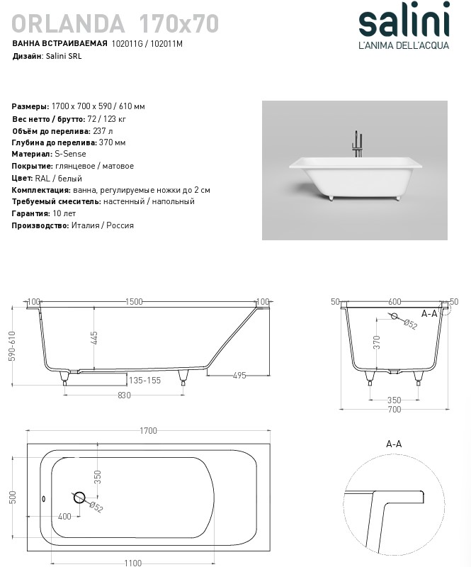 Ванна каменная Salini Orlanda 102011M, размер 1700x700x600 мм. Цвет белый.