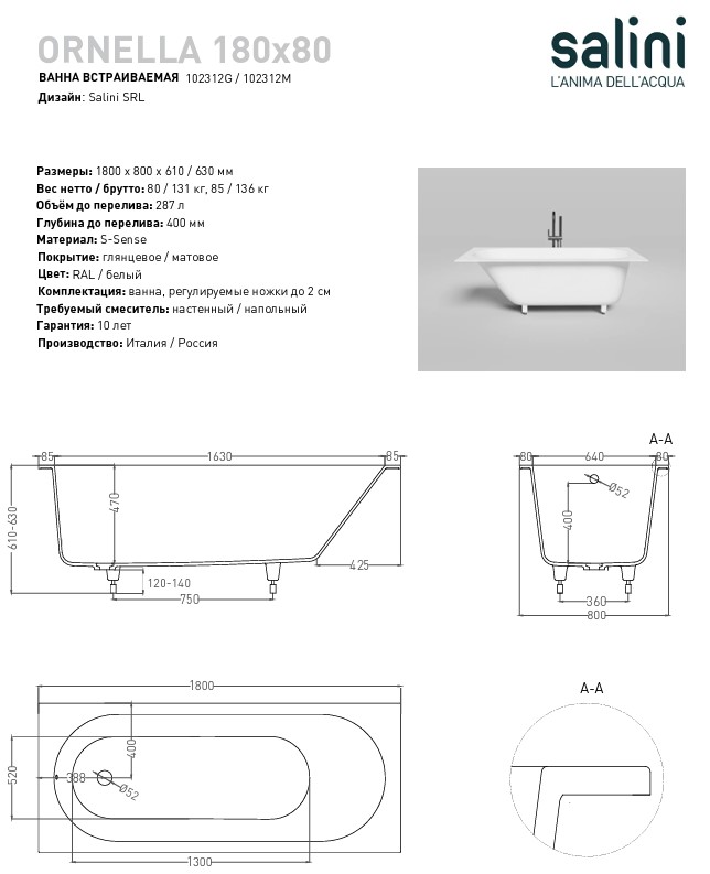 ORNELLA - это серия встраиваемых ванн компании Salini с овальной округлой чашей.
