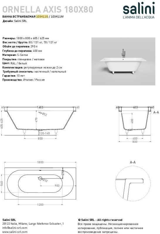 Ванна каменная Salini Ornella Axis 103411G, размер 1800x800x600 мм. Цвет белый.