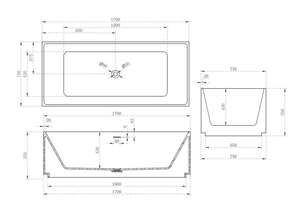 Ванна отдельностоящая Abber Stein 170x75 см AS9602