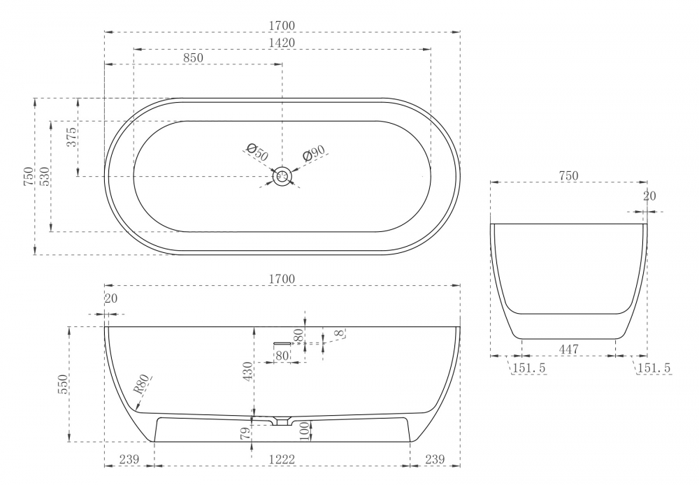 Ванна отдельностоящая Abber Stein 170x75 см AS9613-1.7 из искусственного камня, слив-перелив в комплекте, цвет - белый матовый.
