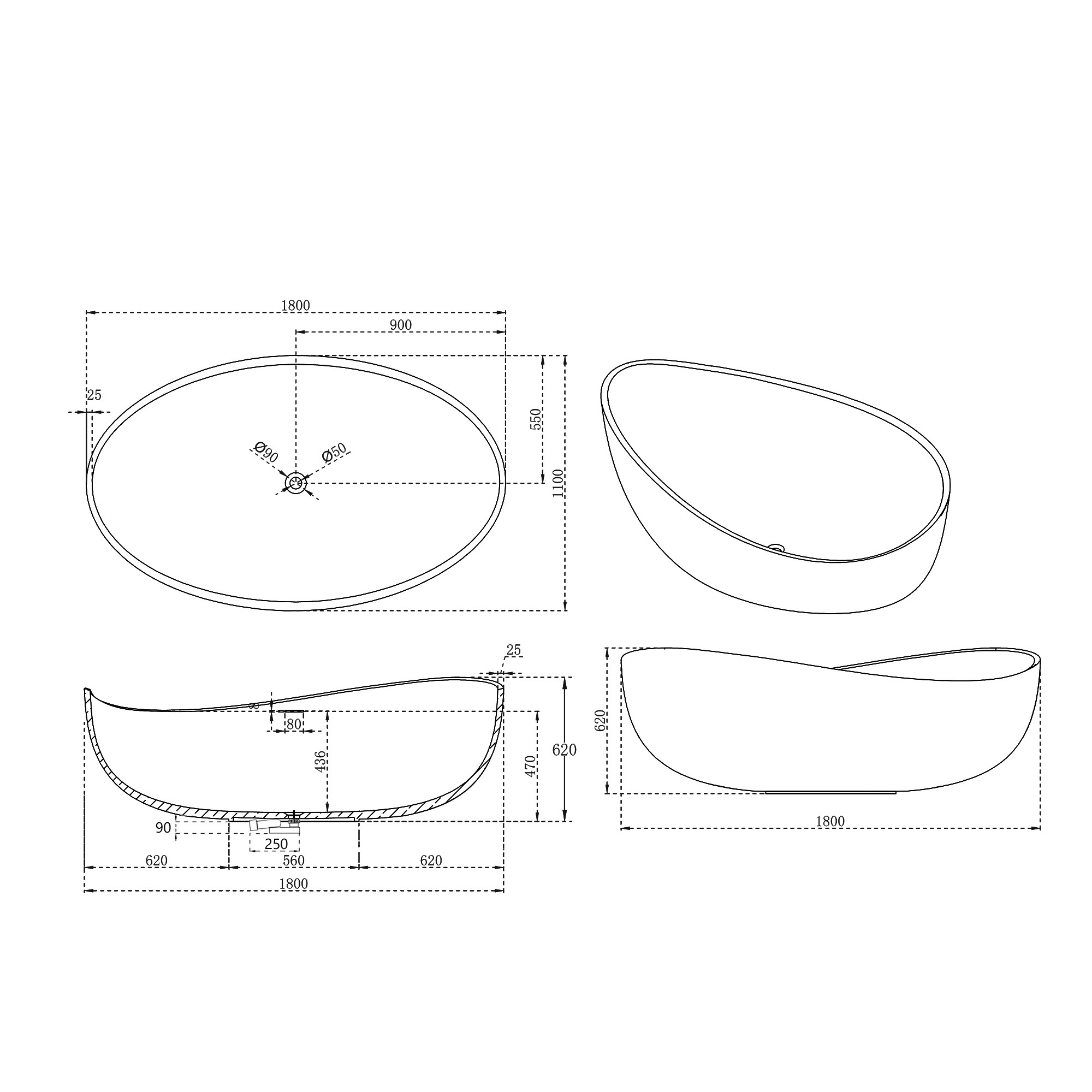 Ванна отдельностоящая Abber Stein 180x110 см AS9639 из искусственного камня, слив-перелив в комплекте, цвет - белый матовый.