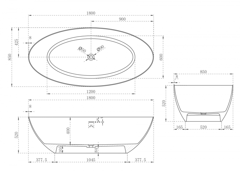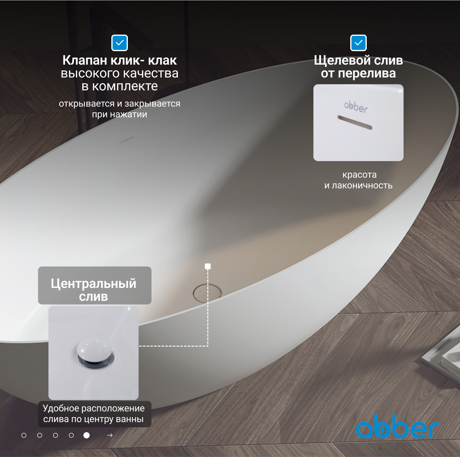Ванна отдельностоящая Abber Stein 180x85 см AS9625-1.8 из искусственного камня, слив-перелив в комплекте, цвет - белый матовый.
