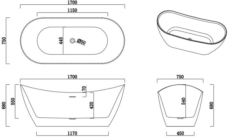 Ванна отдельностоящая AN Cristallo, размер 1700x750x680 мм, цвет белый.