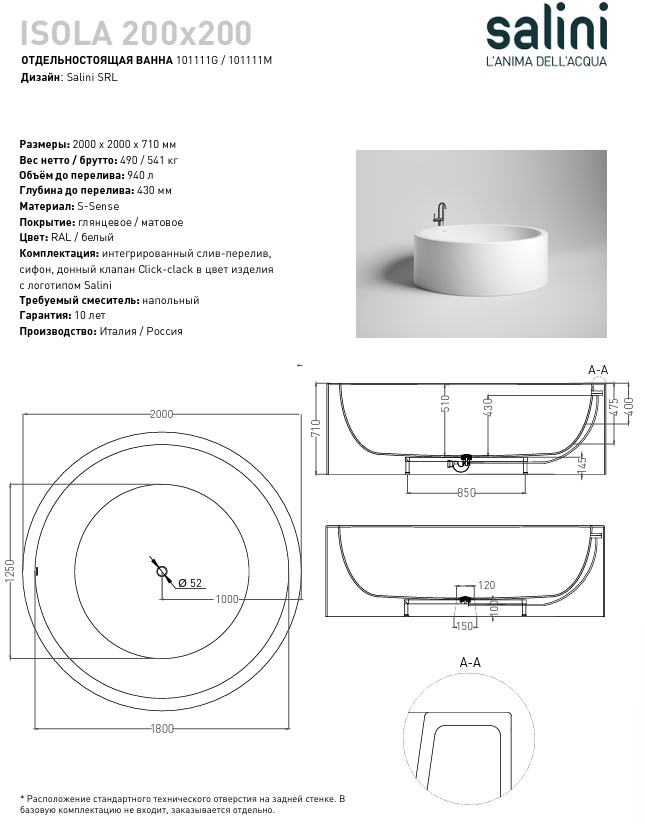 Ванна отдельностоящая Salini Isola 200x200 см 101111M (S-Sense) матовая