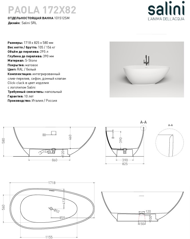 Ванна отдельностоящая Salini Paola 172x82 см 101512SM (S-Stone) матовая