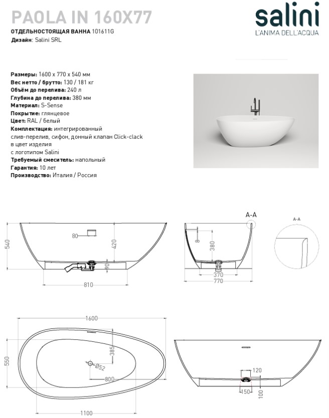 Ванна отдельностоящая Salini Paola 160x77 см 101611G (S-Sense) глянцевая