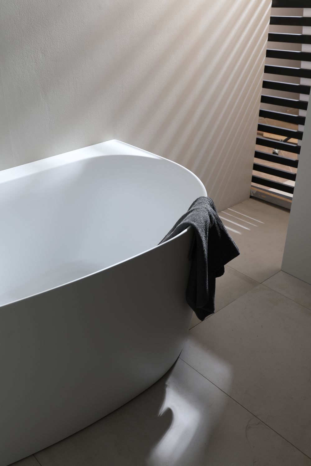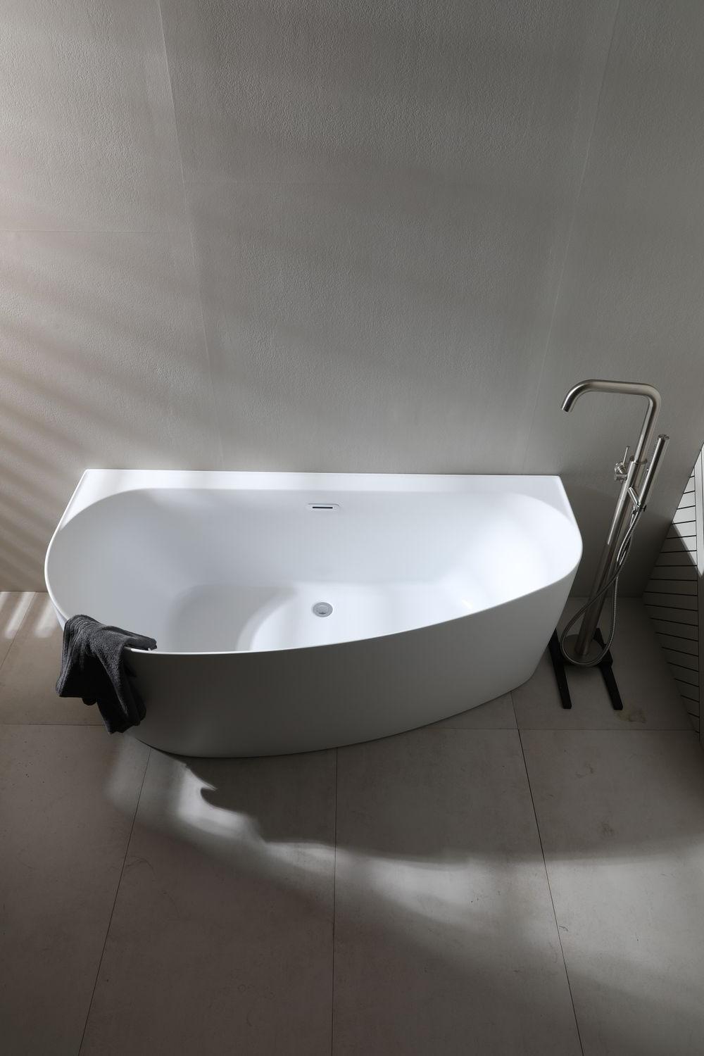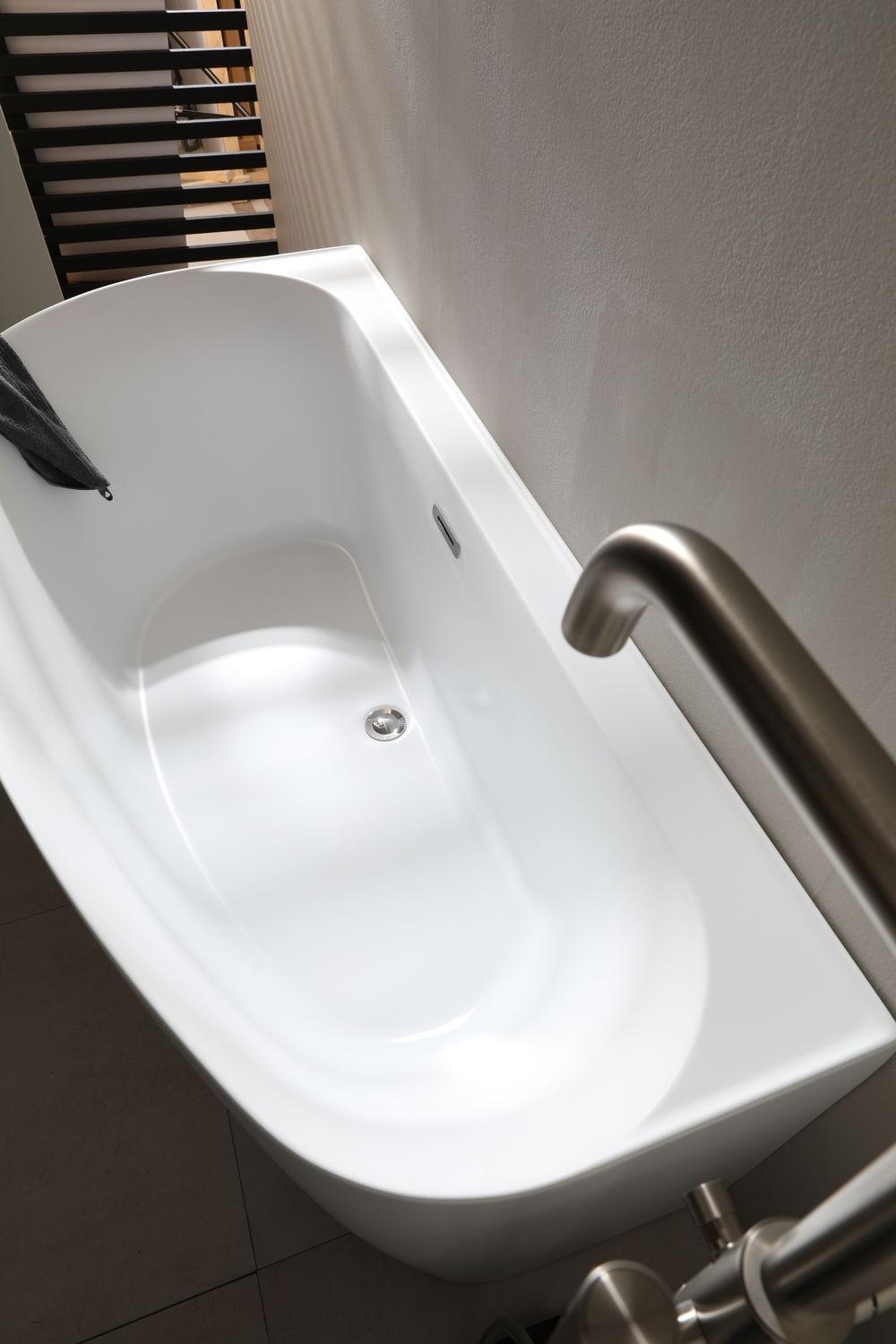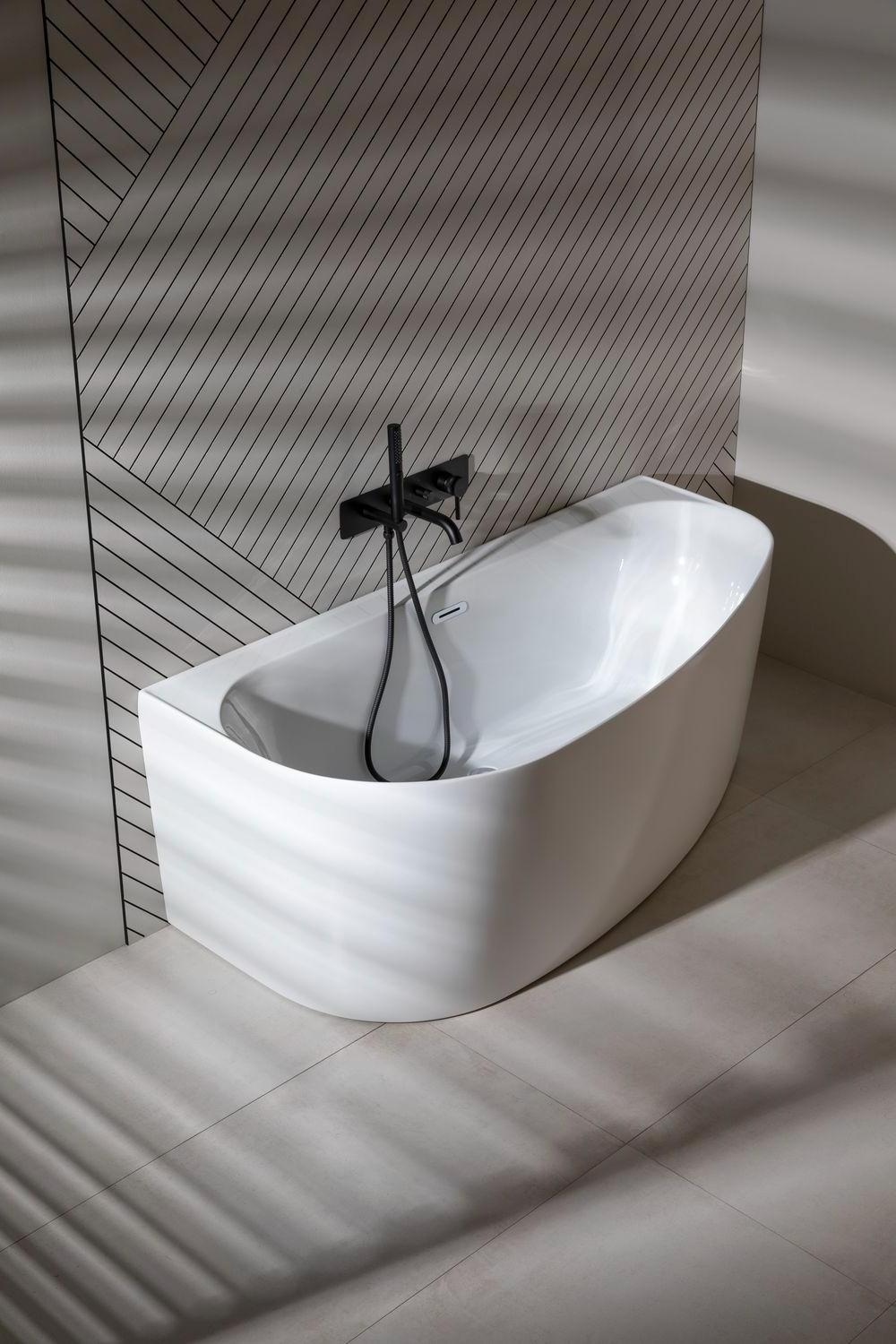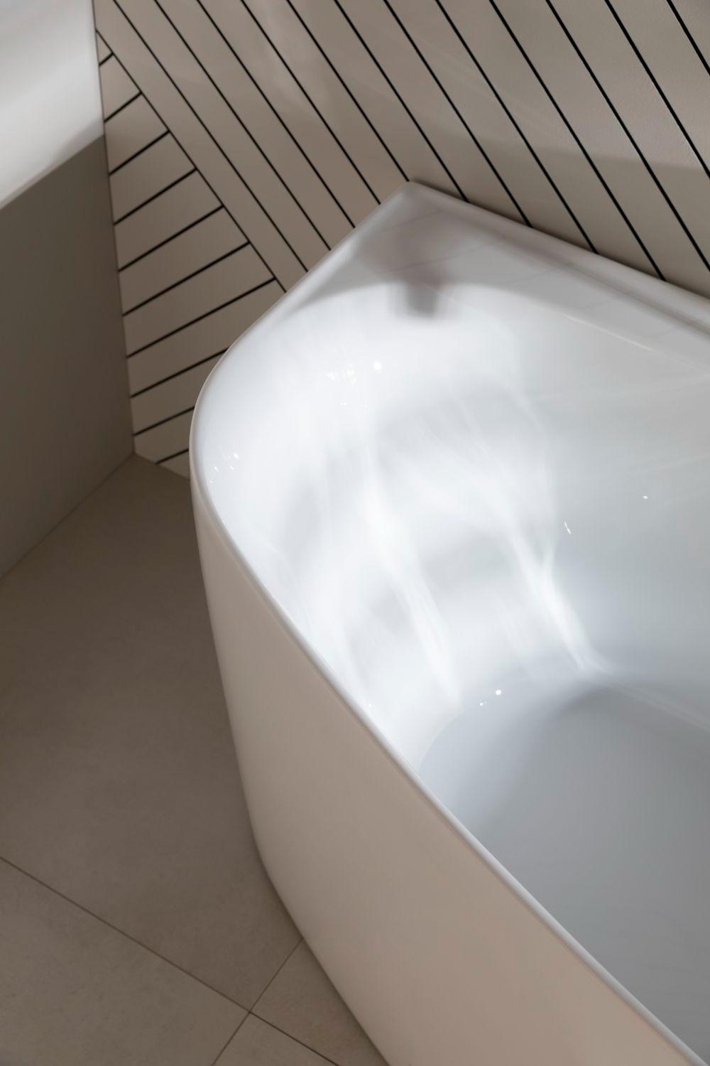 • Асимметричная глянцевая ванна в белом исполнении порадует любителей вечерних процедур с пеной и лепестками роз.