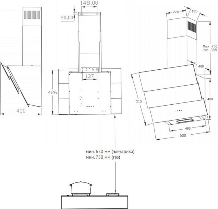 - Ширина 60 см - Следует учитывать и соотносить размеры вытяжки с размерами варочной поверхности. Вытяжка должна быть не меньше, чем сама поверхность. Ширина вытяжки 60 см отлично подходит к варочным поверхностям на 60 см или 45 см.