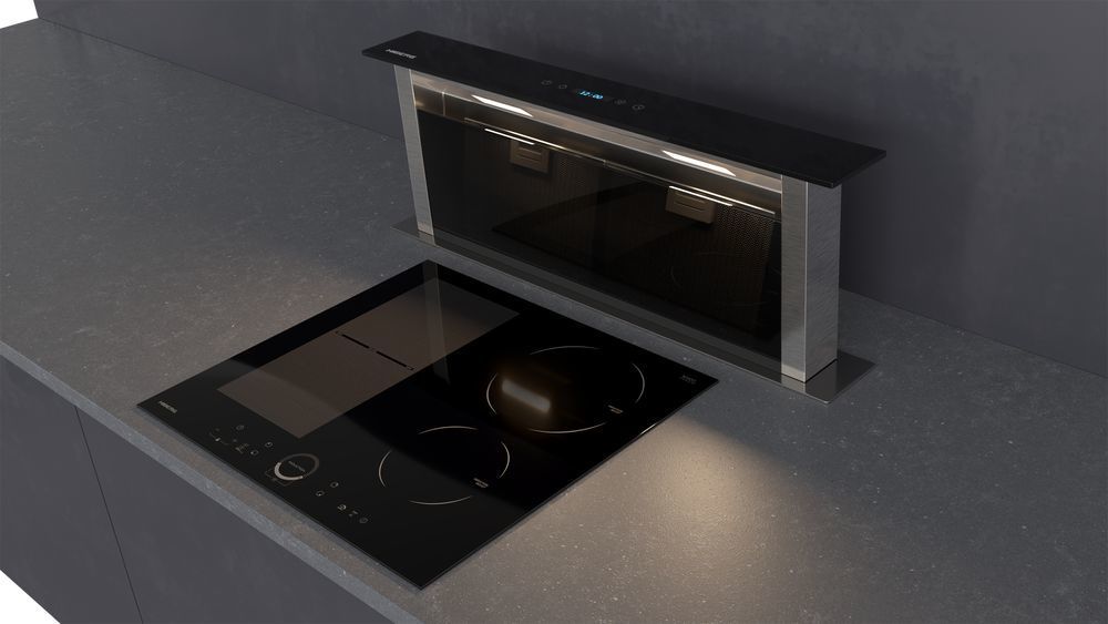 - В рабочем состоянии фильтр оказывается чуть выше уровня столешницы. Все испарения, возникающие при готовке, быстро поглощаются и не успевают подняться вверх, что является одним из преимуществ вытяжки встраиваемой в столешницу.