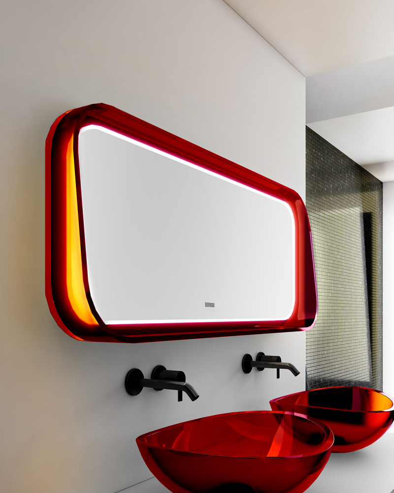 Зеркало Abber Kristall AT6702Rubin с подсветкой, сенсорным выключателем, часами, блютузом, датчиком температуры, прозрачная рама из полиэфирной смолы, размер 1200x500 мм, цвет красный.