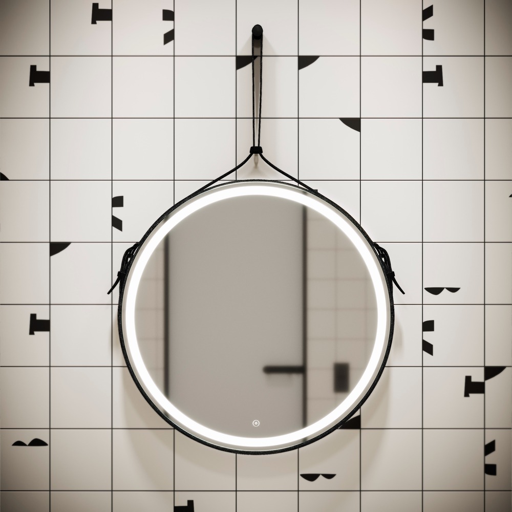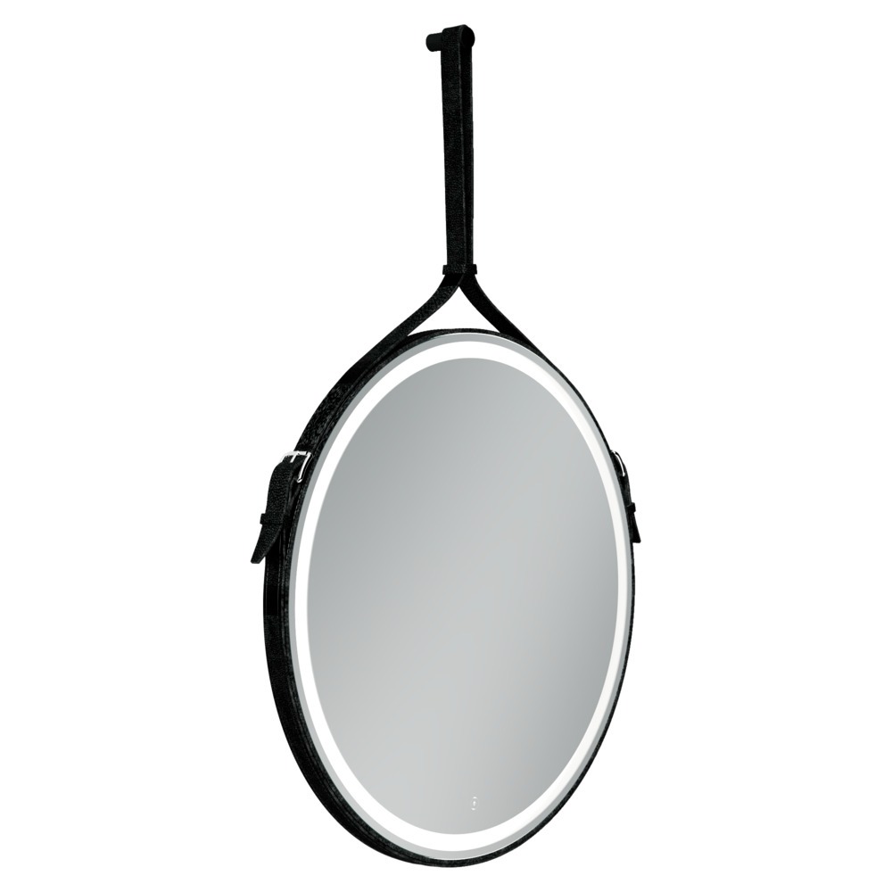 • Зеркало для ванной комнаты круглое с ремнем из натуральной кожи черного цвета